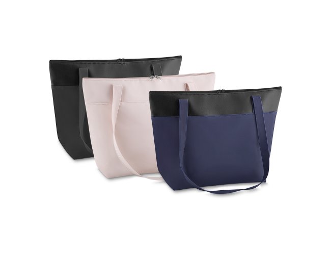 Bolsa térmica em tecido PET Reciclado com 2 compartimentos térmicos, bolso frontal e alça de mão.